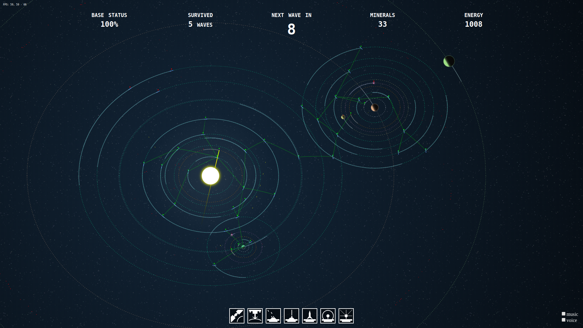 I asked my friend ai Doge if he wanted to enter with me, and he agreed. It was his idea to make a tower-defence style game, and this quickly evolved into the towers actually being satellites, orbiting planets, orbiting a star. On paper it seemed simple, so rather little design went into it from the start and instead things were decided based on how it all fitted together in practice. So sorry if this post-mortem focuses entirely on technical challenges, just the design process was organic and, really, I should have written it up while it was happening. I guess that's just another take-away from this experience!