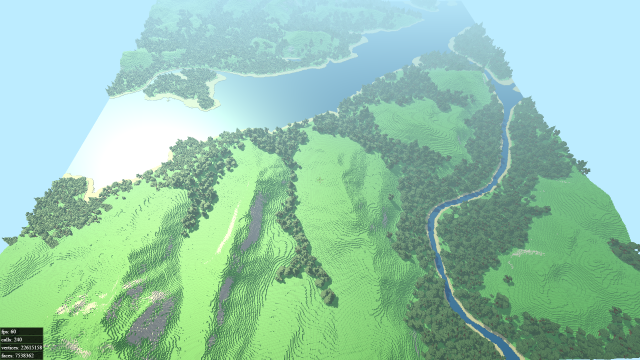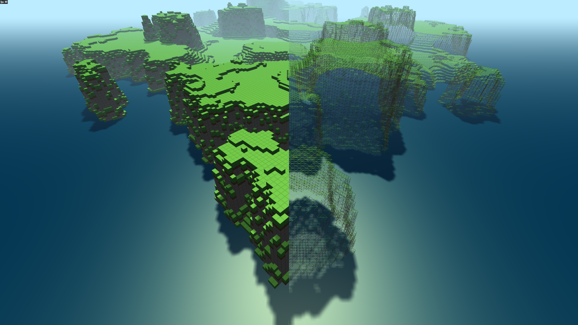 As you can see, it's pretty neat! I also didn't expect that cool little island cluster in the corner, but I'll take it! (Over 33,000,000 voxel space, for those interested in progressive numbers, in this case it's about half a kilometer squared.) FPS is lower because there's over a 1000 chunks being drawn.