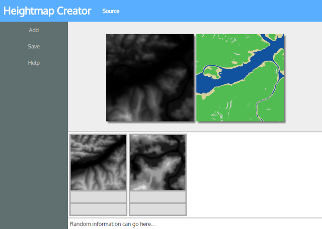 Last time I wrote about creating a stand-alone web app to create heightmaps. This has come along somewhat, though I keep thinking of features to add that could help the voxel engine, as well as other applications. So far it can create a new heightmap by blending any number of given heightmaps together, and the resulting data is used to also generate a colored "terrain" map.
