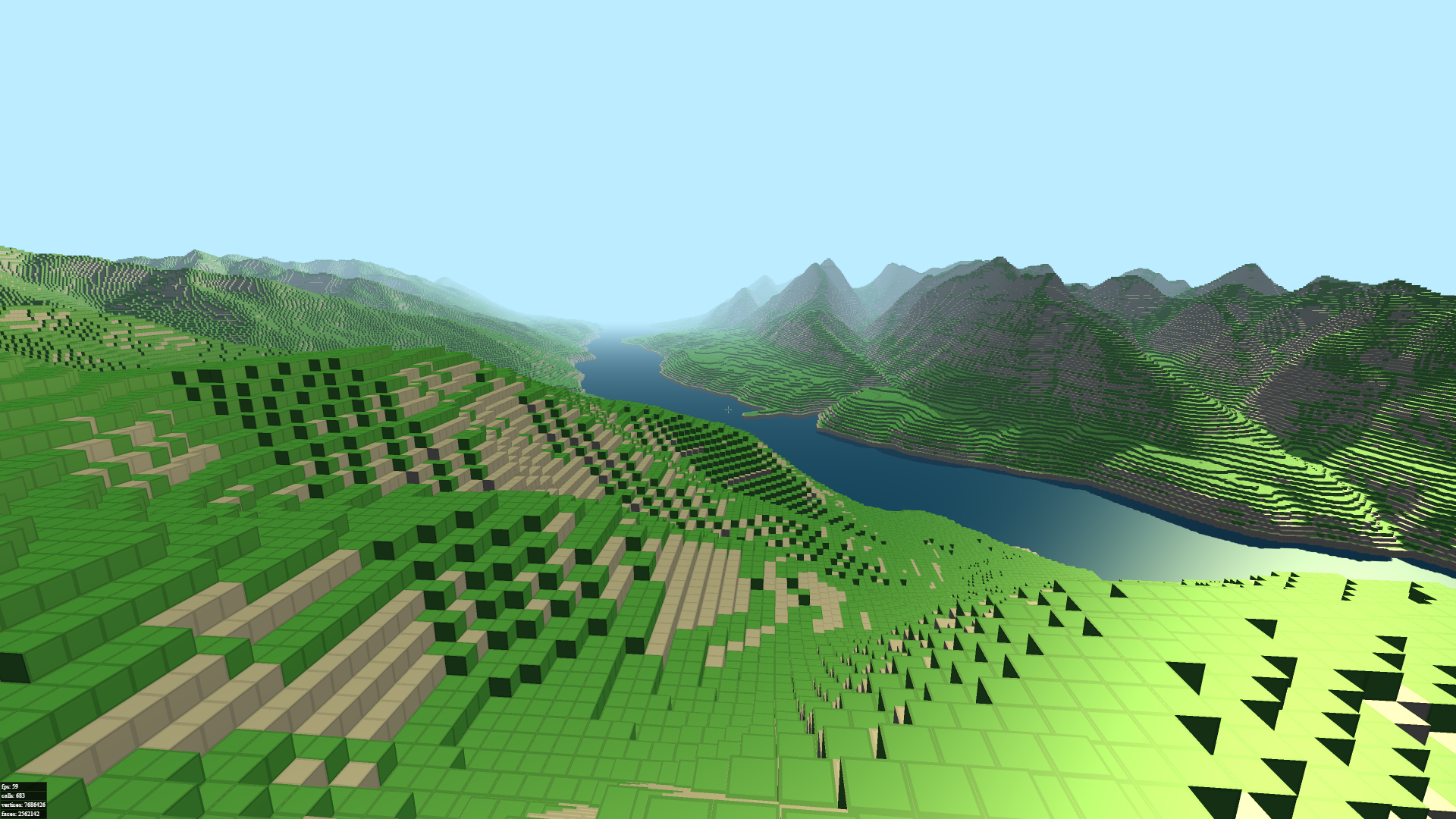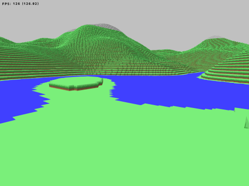 So to show the sort of scales we can work with now I threw together a world with height set to the current max (128). So the mountains are a little grander, though I also decreased the frequency of the noise generation so they weren't all pointy! So this world has over 134,000,000 voxel spaces, and the reason the fps is low here, at 126-ish, is because each chunk is only 16 x 16 x 128, so there's a lot of them for the renderer to iterate through and none of them are even culled! This is an area that'll need a lot of work. Though a quick fix would be to just have bigger chunks. In fact, the new system actually allows us to join chunks together; so if you generate a bunch of them and they are frequently in view, we can join them up to cut down the number of rendered instances. In theory, we also shouldn't need to break up the chunks even if we're editing them. I'll talk more about how that will be done in another post.