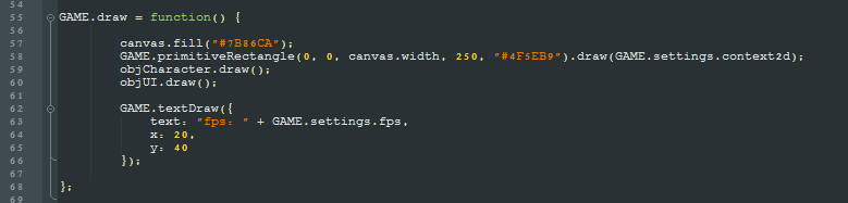 As you can see in the image, nothing is quite settled yet! I think most things will function like the GAME.textDraw() function does and accept all arguments as a JS object. I find this approach very neat and flexible; using one function and only filling in the bits I need. The alternative is the GAME.primitiveRectangle() function here, this can actually be assigned to a variable, but in this case I just want to draw it directly so it calls the method right after the rectangle is defined. But all it's parameters are fixed, and so it's not very flexible.